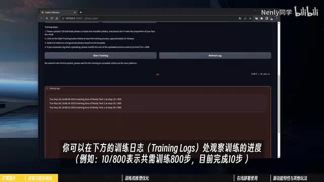 比如现在我使用的这个realistic vision完成以后,点击下方开始训练,它会跳出一个提示框,要求你输入一个user i d就是用户名,你可以理解为是这个写真主人的名字。说好了。击确定就可以启动训练了。初次开启训练可能也会花上十分钟左右的时间下载所需的模型和依赖。如果训练正常启动,你可以在下方的训练日志处观察训练的进度。同时你也可以打开运行web u i的命令行,里面也会实时反馈训练进程。如果训练出错,也会在这里面反馈一些错误信息,可以为你排查问题提供依据。训练结束后,插件页面上会跳出完成提示,我们就可以进入到下一个环节,就是利用这个模型做推理了。推理是机器学习领域的行话,本质上就是一个出图作画的过程。