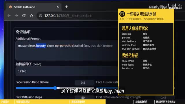 我不说了,你们把评价发在弹幕上吧。在推理方面也有很多我们可以去操作的空间。除了选模型、选人物以外,下面还有一系列你可以展开的高级选项。在这个提示词框里你可以额外输入一系列用于面部重绘的提示词,这个是影响效果的关键之一。默认情况下,它准备的提示词是mar peace beauty,但其实你可以写更多,比如一些通用的用于优化人像近照的提示词模板。另外,如果你的写真主人是男生,beauty容易让人带有女性化的气质,这个时候可以把它换成one boy one man,handsome male focus之类的提示词,你还可以加入一些五官神态特征,它在一定程度上可以更好的帮助你还原你想要的人物特质。但你不用一开始就是特别多,先使用简单的提示词做尝试,在效果不好的情况下,再把提示词作为一种调整手段。下面同样有一系列可以调控的高级参数,和推理参数一样,我不会建议你一个个的去琢磨,因为这也不符合那种easy的感觉。最下方的一系列复选框控制了一些核心功能的开关。