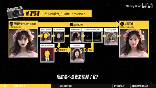 还会先对我们选定的模板图或者上传的图片,这张图我们后面把它叫做用来生成的底图,去进行人脸检测,生成一个用于重绘面部的遮罩。然后在这个遮罩的范围内,将模板图像和初始照片进行两次人脸融合和内部重绘。在这个过程中,control net里的open post kenny的模型会作用在人物的五官上来确保图像的相似性和稳定性。最后针对生成完的图像,它还会再做一次基于stable s二的二次放大,从而实现高清化的图片输出。解释一遍下来,你对这个插件的工作逻辑理解是不是更加深刻了呢?它把很多传统炼丹流程里的操作步骤,通过非常智能化的手段实现了,从而确保了一个简单但却高质量的loa训练。而用它阐述图片的过程也融合了多种不同技术,形成了一个完整的工作流,也节约了你在各种不同的过程插件之间反复横跳的功夫。从技术角度来看,它让在s d里产出人像图片训练loa变得更easy了。而在使用意义上,它也确实是让拍写真这件事儿变得更加easy了。然而要想把这个插件给真的用好,其实也并不容易。