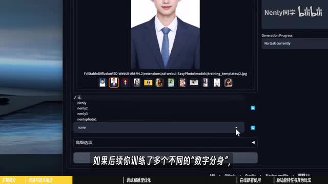 最上方切换到第二个推理标签,最简单的方式是套模板的e c photo为你内置了一系列用于产出各类照片的模板图像有证件照、半身照、唯美写真等等一应俱全。选择一张你喜欢的模板,这里我们拿一张证件照的来尝试一下,在下面选定推理使用的模型和user i d,这里的模型就相当于你平时跑图用的模型。你可以根据你的喜好做选择,而user i d就是刚刚训练时我们输入的用户名。如果后续你训练了多个不同的数字分身,在这里也会有多个选项。刚训练完的i d需要点旁边按钮刷新一下才能在里面看见。点击开始生成,它就会制作写真了。根据你的设备情况,一般需要花费几十秒到几分钟,不等等一小会儿你就可以在右边验收这个新鲜出炉的ai证件照了。你觉得这张照片像我吗?像的扣一,不像的扣二。如果要我个人来进行评价,我觉得可能不太像。