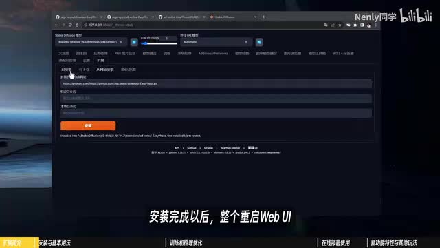 你只需要一个叫做easy photo的使用扩展。我也为了这期视频和你详细介绍它的部署安装使用方法,真的蛮好用的。看完以后你会回来一键三连的。安装easy photo的方法很easy,将它的github仓库地址复制到web u i里的扩展标签里,从网址安装或者直接在扩展列表中搜索easy photo,点击安装就可以在你的stable version里使用它了。如果安装的过程中存在连接问题,你也可以从页面下载代码包,解压缩放到根目录下的extensions文件夹内。安装完成以后,整个重启web u i它会自动下载其他所需的依赖,全部同步了国内的下载源,非常顺利且快速,然后它就会出现在你的web u i标签栏里了。你无需自己配置一些其他的额外软件或环境,但需要在你的web u i里安装control net。因为它会用到control里的一系列控制模型来辅助生成照片,不会还有人没安装control net。如果还没有,请收看之前的c r r n e t基础入门教程,花上一点时间把它安装配置好,并在设置里将这个controller的最大单元数开到三以上,来支持多重control t发挥作用,使用easy photo去生成ai写真的方法。