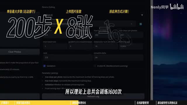 比如你可以适当调高这里面的训练步数,这里的每一步代表a i完成了对训练集中的一张图片的一次学习。e c photo里有两个用来定义步数的方式,分别是最大训练步数和单张图片最大训练步数。e c photo会在训练达到这两者间的最小值时停止训练。以我们刚刚进行的这一次训练为例,默认的情况下一张照片最大训练两百次。我们上传了八张图,所以理论上总共会训练一千六百次。但因为我们额外设置了最大训练八百次,所以练到八百次的时候就会停止。对于一般的老人而言,八百步是一个比较基础的训练水平,提高到一千二百到一千五百步左右,有一定概率取得了更好的效果。所以你可以通过调节这两个参数,让他练多几步再停止。同时训练的时长会随着步数增长被延长。