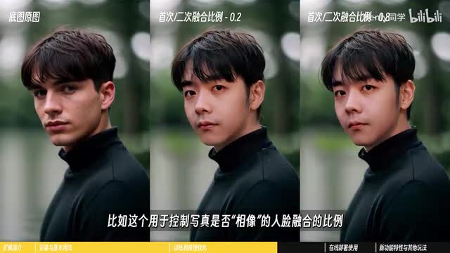 一般我都会建议你全部勾选。如果你对图像分辨率的要求不高,取消勾选最后一个超分的选项可以节约掉。最后使用stable s r放大的这部分时间。上方的滑块控制的是在刚才我们提到的那个两次融合的绘制过程中面部的融合方式。你可以通过这些参数调节控制a i生成的人像细节,不过它们的影响是非常细微的,比如这个用于控制写真是否相像的人脸融合比例在最大值与最小值上的差异其实并不大。所以只有当效果不尽人意的时候,我才建议你到这里面找一些解决方案。最下面的两个附加功能其实非常有意思。这个展示面部相似度得分会在生成后附上一张样本来源。你可以很清晰的看到它是学习了你上传的哪一张图片,也揭示了推理过程中进行面部匹配的这一流程,对你挑选训练样本也会有一定的启示意义。