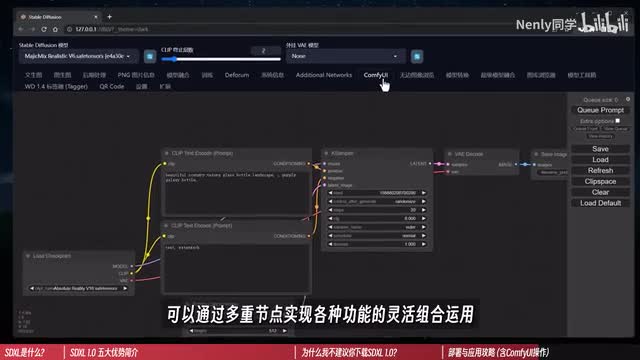 将它下载下来以后,点击右侧的load按钮,加载这个j s o n后缀文件,它就会自动在coffey中为你把该有的东西都配置上了。在coffee u i的界面中,鼠标滚轮控制界面缩放,左键按住拖拽,可以让镜头聚焦在不同的节点上。在左上角的三个文本框里输入提示词,上面是正面,下面是负面。左边用自然语言描述,而右边作者会推荐你将其中的一些核心概念体现出来,做一个强化。右边这一部分节点设置的是出图的分辨率,采样部署算法等。web u i中也有的参数,只是形式变了而已,但含义是完全一致的,其他地方都不用做额外的设置。除了右下角这里有个用于refiner的upscale model,有点类似于我们在使用高清修复时选用的算法。默认的这个n m k d super skill不是web u i预装的,所以会报错。