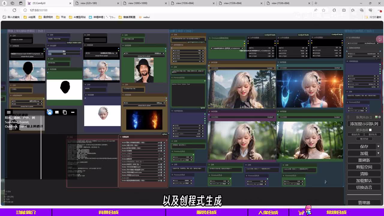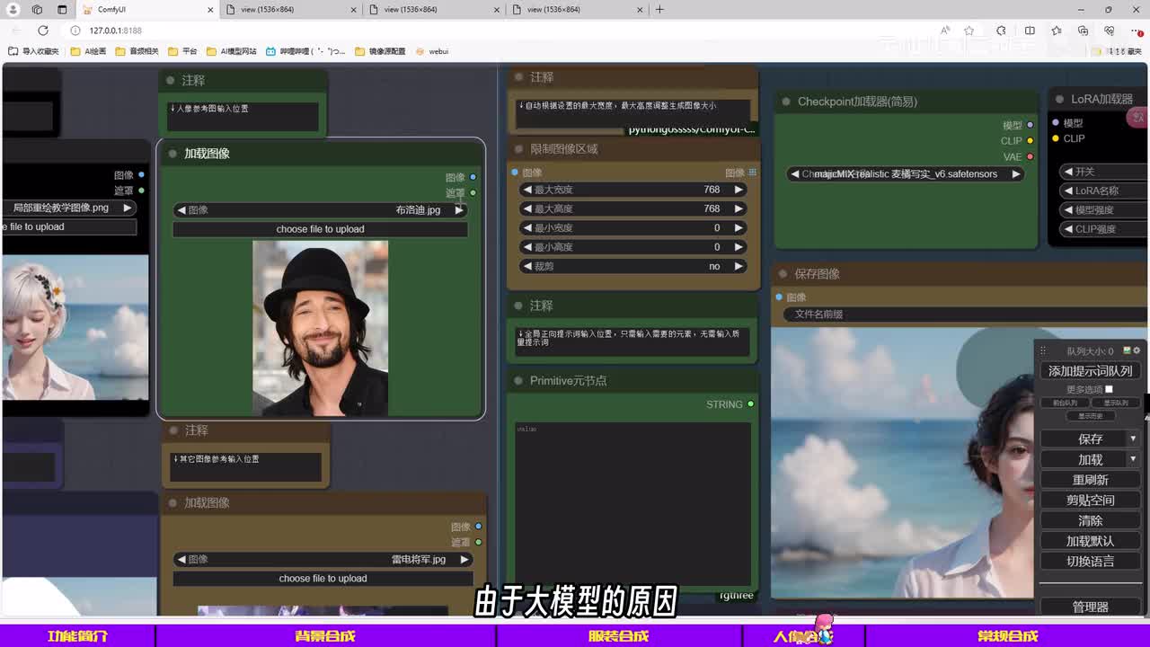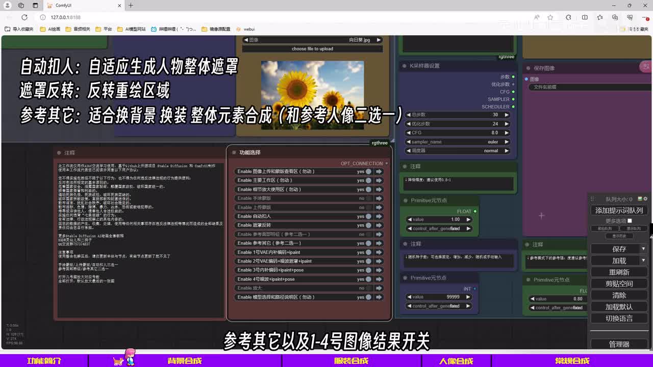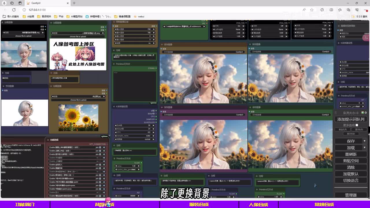 第一个更换人物背景,只需要按照注释的原图上传区上传原图,以及背景参考区上传背景图,然后在功能区依次打开,自动扣人。对,就是扣人,除了人什么也不扣。遮罩反转参考其他以及一到四号图像结果开关无需设置繁琐的参数遮罩提示词,这些在a i摄影小助手工作流里都会进行自适应处理,我们只需要直接点击运行就可以得到四张不同结果的背景更换图像了。