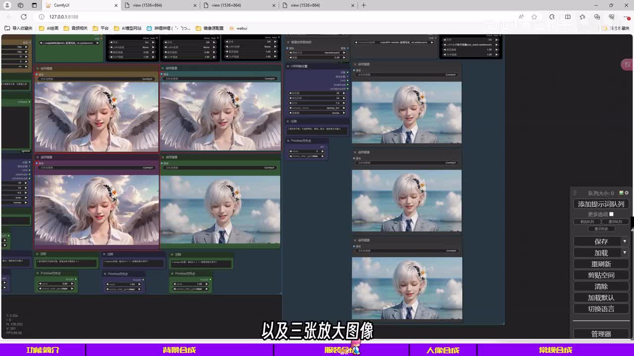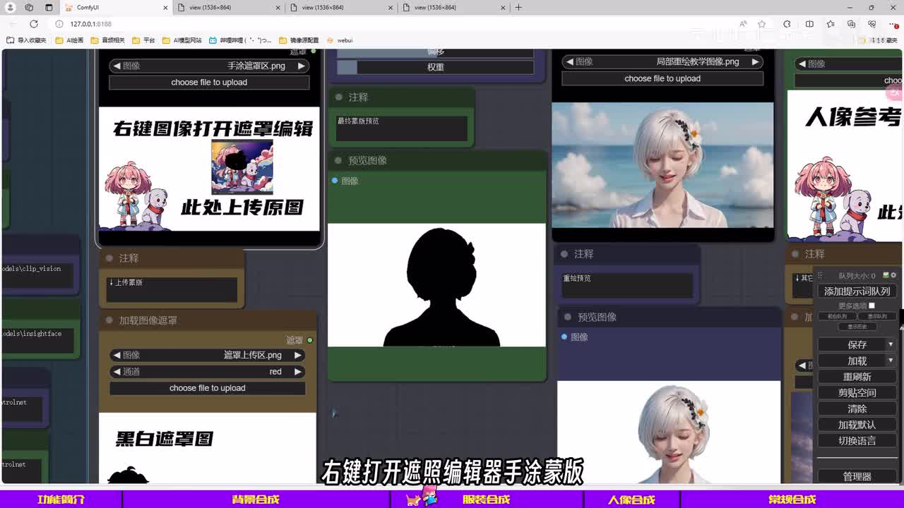 当然,放大倍数也可以在放大使用区进行选择哦。第二个指定换装,这里我们可以使用手图遮罩或者上传遮罩。这里就只演示手图遮罩,按照说明提示上传原图,右键打开遮罩编辑器。首图蒙版之后点击保存,并在功能选择区打开首图蒙版,并上传我们需要更换的服装参考图,到其他参考区直接运行o k服装更换就完成了。