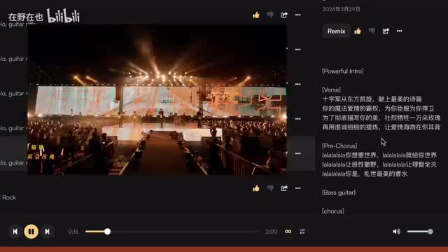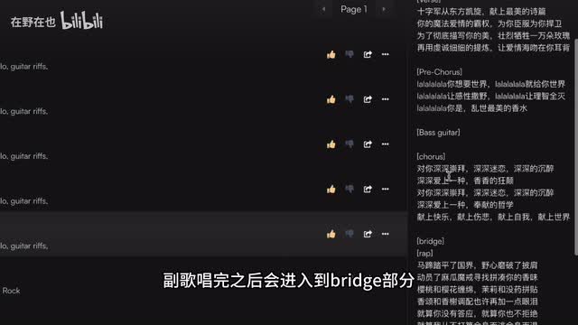 让我们通过一个实际的案例来看看怎么使用。前几天我有生成一段五月天的歌曲,因为香水整体的歌曲结构是开头是一段很强有力的前奏,接着就进入到了主歌部分。在主歌和副歌之间有一个小小的前副歌作为过渡,中间还夹杂。打了一段base的solo副歌唱完之后会进入到bridge部分。这里特别的地方在于指定了用rap的方式来进行演唱。bridge完成之后,歌曲又回到了副歌部分,副歌结束后就是对应的乐器solo直到歌曲最后结束,我们来感受一下solo生成的音乐效果。刺激狂风暴雨。还是世上最美。