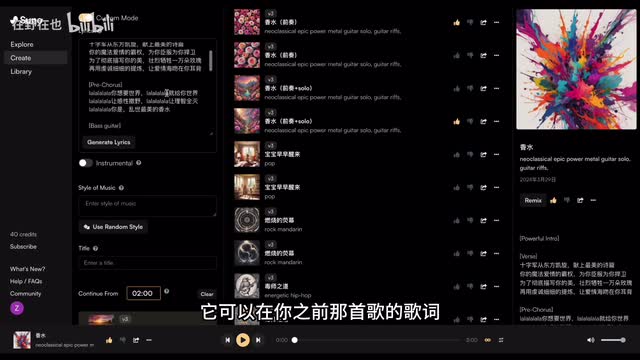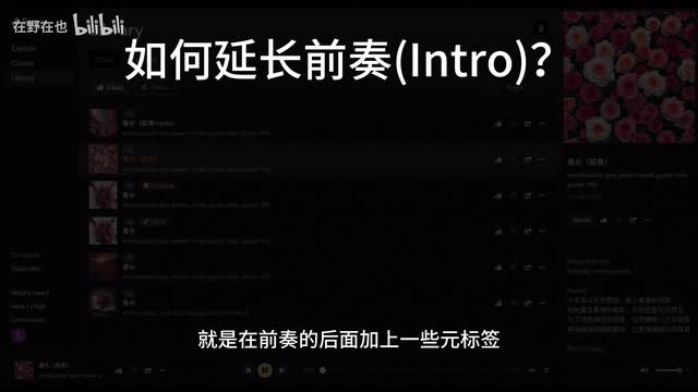 按照原计划,这首歌应该先有一段前奏的铺垫,再慢慢过渡到主歌部分,但是它实际生成出来的效果其实只有几个鼓点,前奏部分几乎没有什么存在感,所以我们如何让前奏变得更长一点,让听众进入到主歌部分之前先有一段情绪的铺垫,这是我们需要解决的第一个问题。第二个问题,苏呢目前一次只能生成两分钟的音乐,那没有唱完的部分怎么办?所以如何生成一首完整的音乐,也是我们需要去解决的问题。接下来我们一一解密。关于第一个问题,想要让前奏长一点,其实方法也挺简单的。就是在前奏的后面加上一些元标签。这里我给大家分享两个方法,方法一就是在前奏后面加上melody instrumental的标签,意思就是加入一段有有旋律的乐器演奏,我们来听一下效果。这里生成的辅助律都是由系统根据歌词大意来去随机生成的。方法二,如果我们想要用特定的乐器来进行演奏,比如吉他,就可以加上gita solo这样的标签来指定吉他来进行独奏。