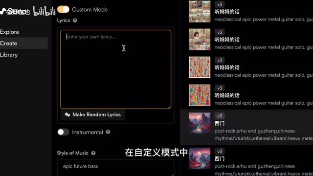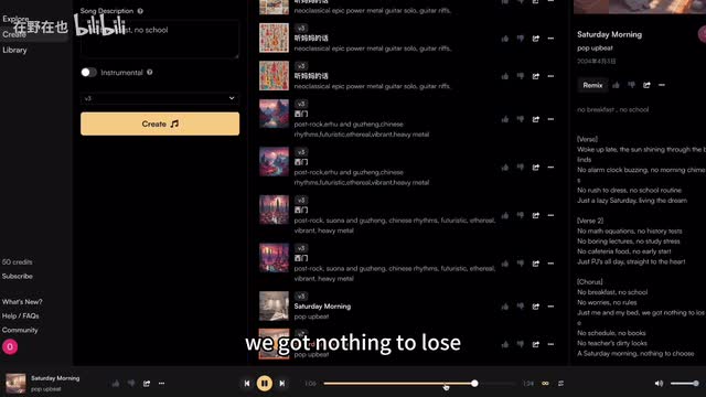 我们先来看默认模式,在默认模式中只需要根据心里想的音乐风格或者是音乐主题,再用文字进行描述,它就能够根据描述去生成相应的音乐内容。目前sono已经支持了五十多种语言,所以你输入什么语言,大概率就会生成什么语言的歌词。比如我们输入no breakfast,no school. 不吃早餐不上学,我们来听一下有什么样的效果。work, place the sunshine and to the point. the alarm clock was in no morning times. 点击创建之后,每一次创建音乐sono会默认创建两首歌曲,每首歌曲消耗五点积分。每个账户每天都默认有五十个积分,就意味着一天能够创建十首歌曲。just me. no schedule. 在sono的默认模式里,如果想要创作纯音乐,那操作起来也很简单,只需要打开instrumental叫乐器演奏的这个选项就可以了。一旦开启sono就会根据我们的描述来生成纯音乐,比如输入一江春水向东流,古筝中国风酥呢就会根据这个描述给我们来生成一段两分钟的中国风的纯音乐。我们开启左上方的自定义模式开关,就能进入到自定义模式。