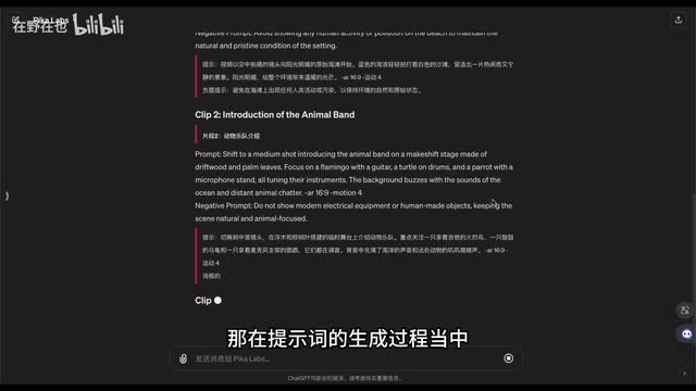 在g p t s的商店中搜索一下皮卡,我这边使用的是皮卡labs,选好之后我们就可以直接告诉他我们的视频需求。比如想要一个一分钟左右的视频,视频里面有树懒在沙滩上唱摇滚,周围有一堆动物,大家都随着节奏进行摇摆。chat p t就会根据我输入的提示词,自动的去生成相关的正向和负向提示词。因为皮卡每一段视频只能生成三秒的内容,所以chat p t就会自动的去生成很多段的提示词。那在提示词的生成过程当中,我们就进入到皮卡的官网,登录皮卡的方式也只需要有谷歌账号就可以使用了。那登录之后系统会默认赠送二百五十点积分,每生成一条视频就会消耗十点积分。皮卡支持好几种的视频生成方式,可以直接使用提示词,也可以通过提示词加参考的图片或视频进行新视频的生成。还可以给生成的视频增加音效,不过我们已经有sono生成的音乐了,那音效这一部分我们就可以先关闭它,同时我们也可以控制视频生成的尺寸。