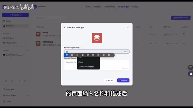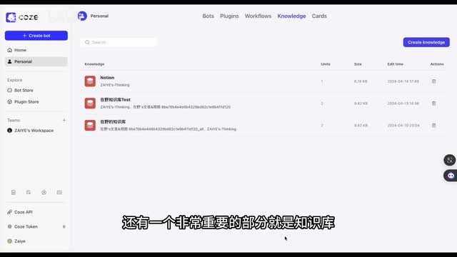在这里就包括了几个重要的组件,如知识库、变量数据库和长期记忆。首先就是知识库,点击加号,你可以添加已经上传的知识库,或者创建一个新的知识库。那我来演示一下如何创建知识库。点击创建知识库,页面就会跳转到个人空间中的知识库模块的页面,输入名称和描述后,就能往知识库中上传内容了。每一个内容叫做一个unit单元添加单元的方式,支持文本格式和表格模式。在文本格式中支持上传本地文件,如p d f t s t等文件格式的文档,也可以通过链接来添加网页。
