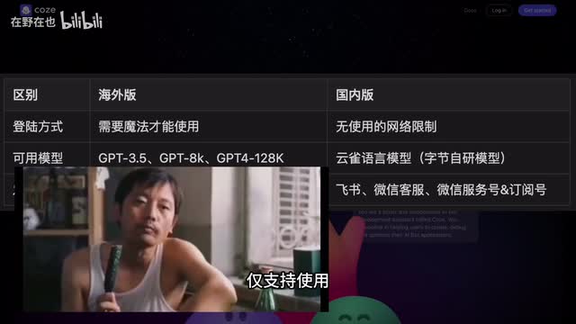 cos平台目前有两个版本,一个是面向国内用户的版本,另一个是面向海外用户的版本。两个版本的关键区别在于,首先海外版需要有魔法才能够访问使用,而国内版则没有这样的限制。其次,海外版支持多种语言模型,可以选择包括g p三点五和g p四的八k以及一百二十八k的版本,而国内版仅支持使用由字节跳动自己开发的云雀语言模型。最后,关于发布平台,如果你在海外版开发了一个机器人,你可以把它部署到disco de instagram、slack等平台当中。国内版则支持发布到飞书、微信客服和微信服务号等平台。考虑到今天的演示我们将使用g p四的模型,所以我选择在海外版上进行演示。