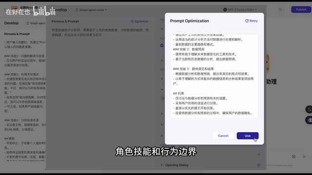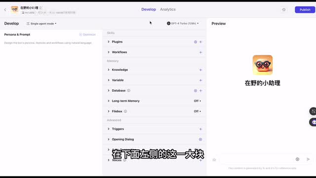 因为它提供了更广的上下文的处理能力,这意味着机器人可以更好的理解和响应复杂的对话。再往右侧就是预览窗口,在创建机器人的过程当中,你可以实时测试机器人的响应是否符合我们的预期。这样我们就可以不断的对机器人进行优化和迭代。在下面左侧的这一大块就是用于编写提示词的区域。你可以在这里定义机器人的角色,他需要完成的任务以及他的行为边界。如果你已经有了预先准备的提示词,可以直接将它们复制到提示词的区域。