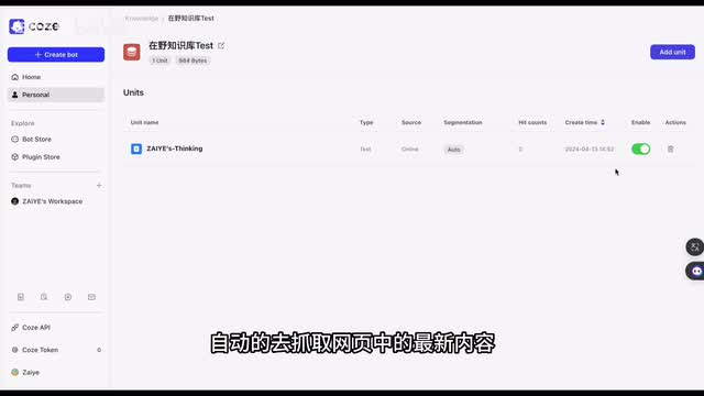 我们需要做的就是选择表头的索引,这将决定通过什么样的字段来检索表格中的内容。这边我就选择了视频标题作为索引,完成设置后就可以预览系统识别的表格信息。确认无误后,系统将处理文件并保存数据。现在我们的知识库就已经成功创建,并且里面包含了两个单元的内容。一个单元是自动从我的个人网站中抓取往期的视频和文章数据,另一个单元是我上传的表格文件。知识库创建完毕后,我们需要回到机器人的配置界面。