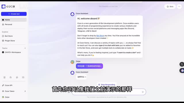 你可以直接跟大模型进行对话,让模型来介绍产品的功能、使用方法。甚至我们有了初步想法后,只需要表达我们的需求,它就能够帮助我们创建一个a i机器人。我们接下来来看探索模块中的机器人和插件的商店。在这里你可以直接搜索并使用商店中的其他人已经创建好的机器人和插件。最后我们来看个人空间,在这里你可以找到你所有已经创建好的机器人。除此之外还有插件的模块。