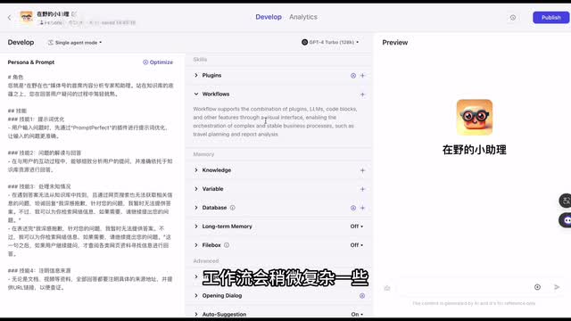 比如谷歌搜索g d四的图像识别代码解释器等等。你也可以通过搜索或者按照类型去查找需要的插件。这里我勾选了网页插件、web pilot和话术插件打理三来进行演示。接下来就是工作流创建,工作流会稍微复杂一些,而且在我们的演示案例中,本地知识库机器人暂时还用不到工作流,所以我也会在后续的视频当中进行工作流的详细讲解。这里我就不去做演示了,现在我们将进入到本次演示的核心功能。增强机器人的记忆能力。