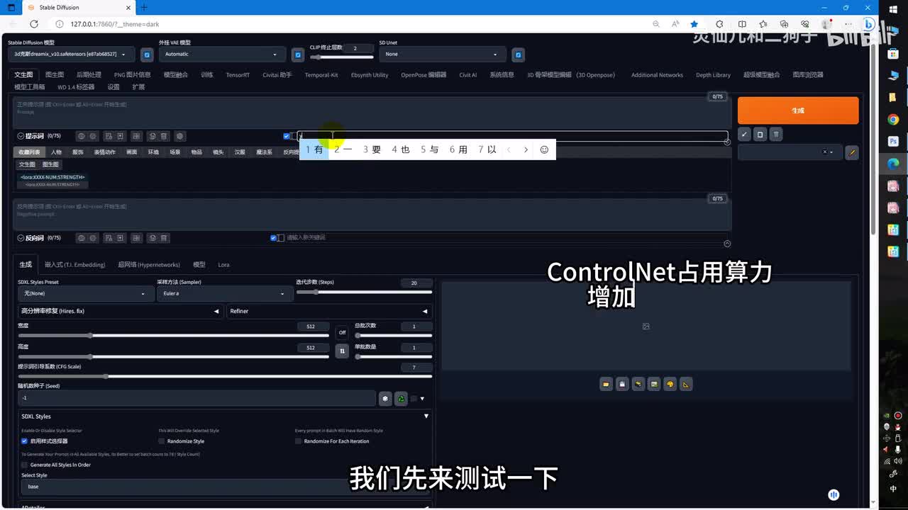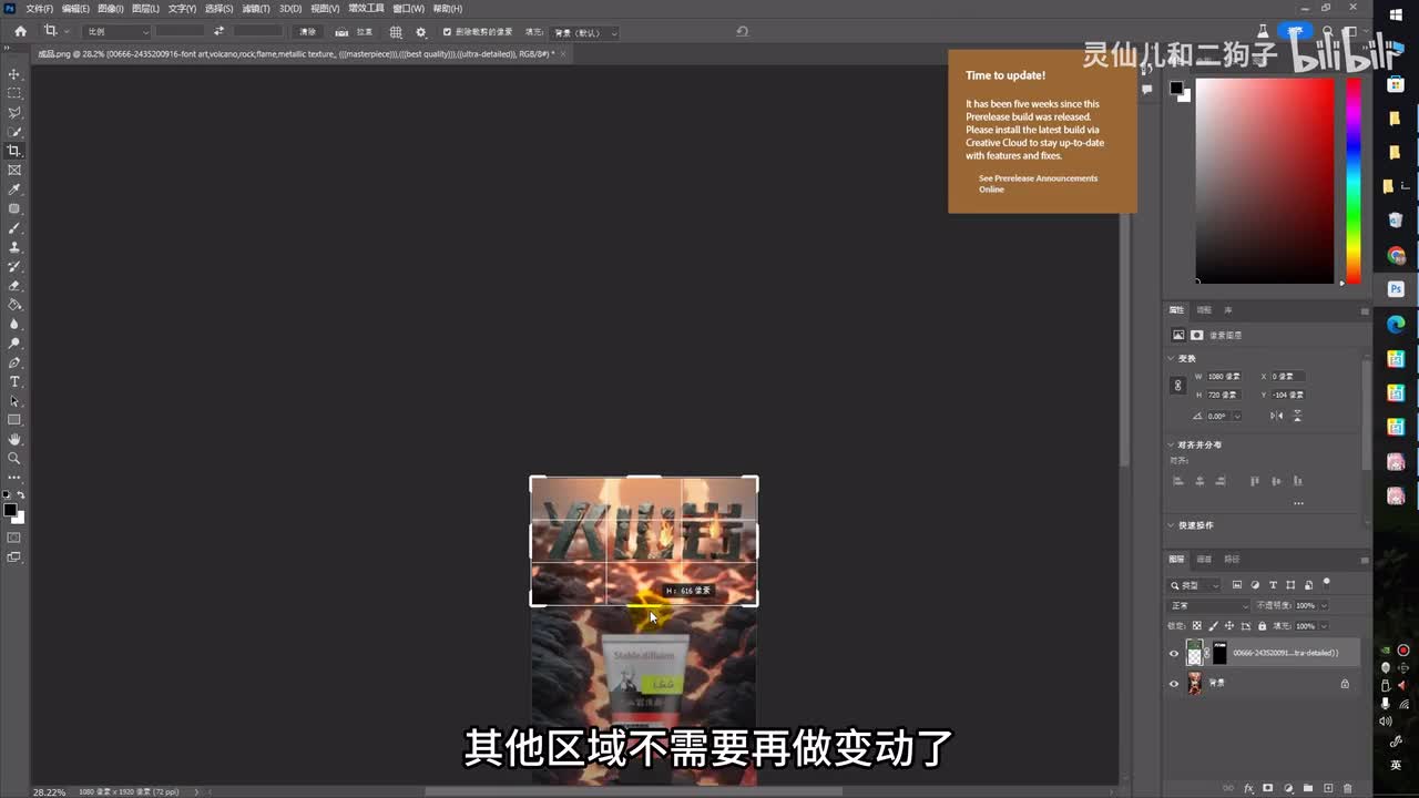 先来跑一张看一下效果o k整个图像的颜色风格没有任何问题,这个时候我们再点。即启用c t r l t点击生成。效果还不错,一发入魂就不用再继续抽卡了。第二步。回到p s放入我们刚才扩散好的图像。