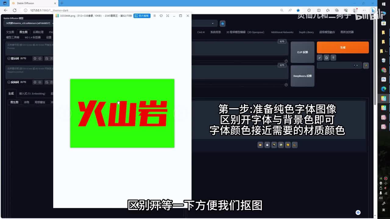 是不是就入木三分?首先用其他的图像处理软件准备好一张纯色的字体图像,两种颜色一定要区别开,等一下方便我们抠图。回到图层图,上传好我们准备的字体图像,输入提示词,字体艺术、火山、岩石、火焰、金属质感,同样选择提示词模板,选择采样器s d e cross调整迭代部署。宽高调整的低一点,因为我们等一下还需要继续处理。