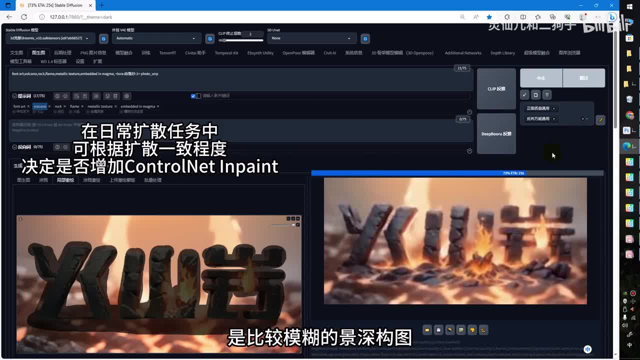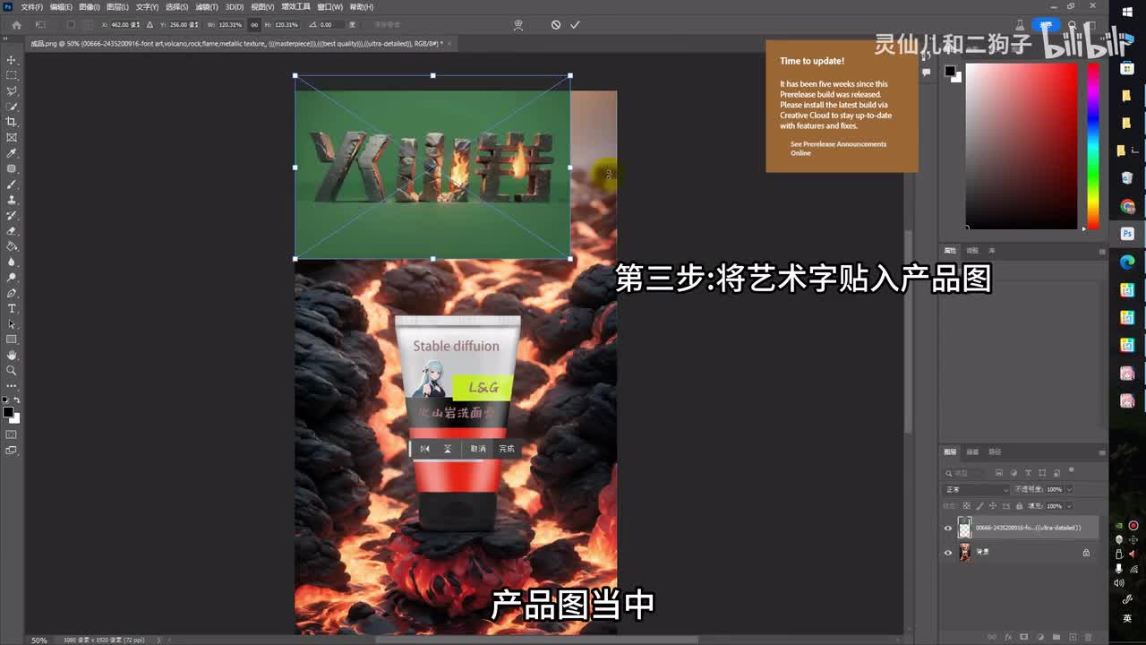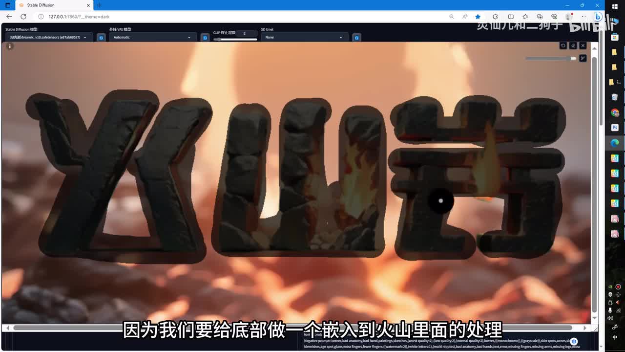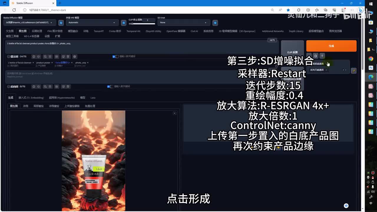 类型选择放大算法,放大倍数调整为一。因为这里我们的画布已经调整为了幺零八零乘幺九二零,打开told a一,同时打开c t l e t。同样选择开,你点击生成。ok可以看到我们的产品已经融合在了扩散之后的火山石块上。但是上面有一点问题,没有关系,你可以选择继续抽卡或者通过p s进行处理。