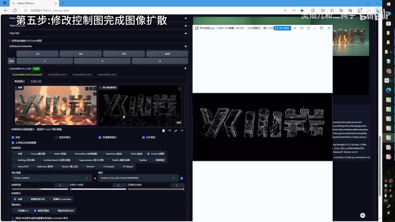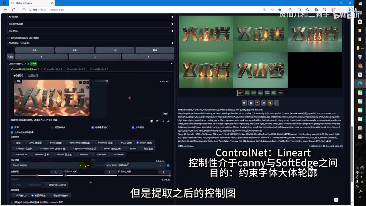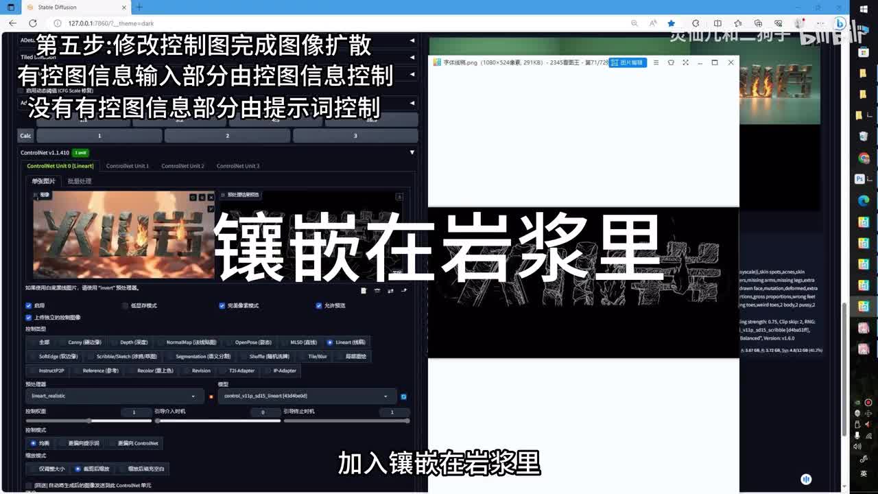 调整采样器。调整迭代步数,读取图像的宽高重回幅度调整为一c t r l l t上传好我们的文字图像。这里选择写实线稿,但是提取之后的控制图并没有嵌入到岩浆里的线条效果,所以我们需要对控制图做局部的修改。右上角保存控制图。再来到p s。