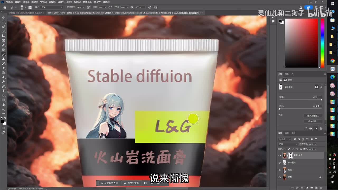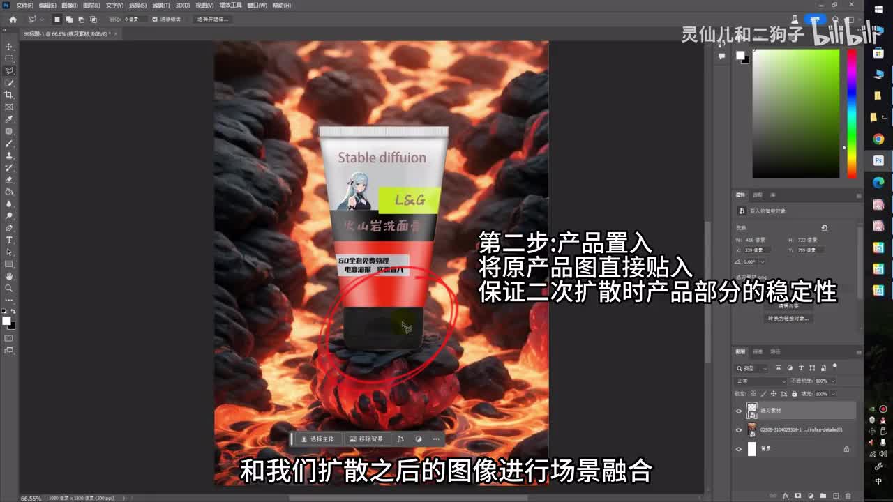 接下来我们选择一张合适的字体图像回到p s,将我们扩散之后的火山岩字体图像放入到。产品图当中,然后把字体单独勾出来。直接选择移除背景,再对没有扣干净的部分进行简单的处理。