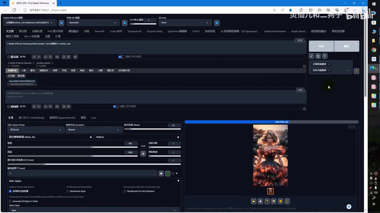 这里可以根据预览结果适当的调整一下阈值,目的就是为了让s d能够知道我们的产品。他的轮廓究竟是怎么样的?ok打开完美详述,但是我们暂时不点击启用。我们先来测试一下,提示妊娠一瓶洗面奶。产品海报,再选择符合产品图像的。风格罗拉选择提示词模板,选择采样器,调整迭代步数设置宽高宽高比不要设置的太大。