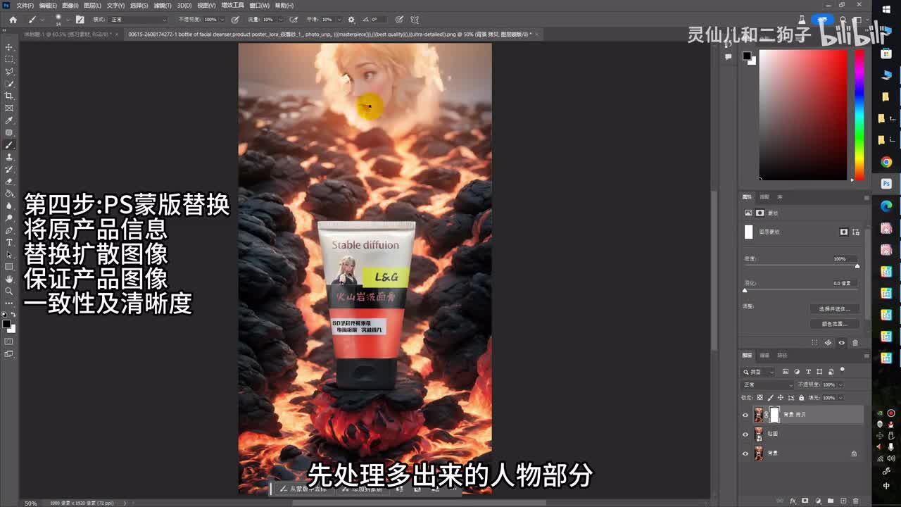 因为二狗子不太喜欢抽卡,所以我们来到p s打开我们刚才扩散之后的图像,然后将我们第一次p s贴图的产品图放到图像之上。复制一张图层,启用蒙版,先处理多出来的人物部分。接下来再放入我们最开始的原始产品图,因为我们要保证我们的产品像素足够清晰。好,接下来就跟之前的a i摄影一样。