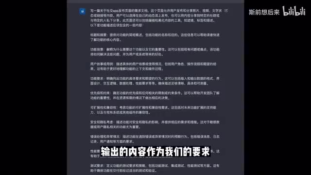 我们再来看一下chat g p t给出的需求文档。当然我们也可以去分步骤让chat g p t依次输出需求文档的结构、功能清单、功能描述要求。再把chat g p t输出的内容作为我们的要求输入进去,进行需求文档的输出,那就可以生成更加详细的需求文档了。但这种对于chat g p t上下文理解的篇幅长度要求会比较高,在三点五版本上其实是比较难实现的。