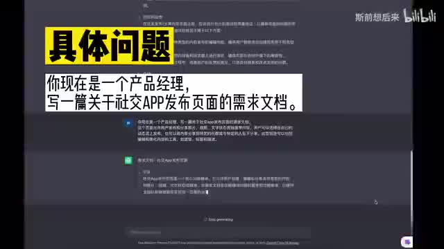 这次我们使用的是chat g p t,通过发送特定的指令,分步骤来帮助我们写需求文档。我来给大家演示一下,这里的提问呢有一些技巧。如果直接让chat g p t去输出一篇需求文档,它给出的内容呢会比较宽泛。所以我们提问的方式呢,最好是具体问题加具体要求这种结构。