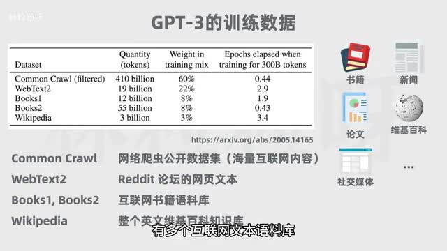 在第一步的预训练中,首先需要海量文本作为原料,让模型从中学习。比如g p t三这个基座模型的训练数据有多个互联网文本语料库,覆盖书籍、新闻文章、科学论文、维基百科、社交媒体帖子等等。训练数据的整体规模是三千亿的token。