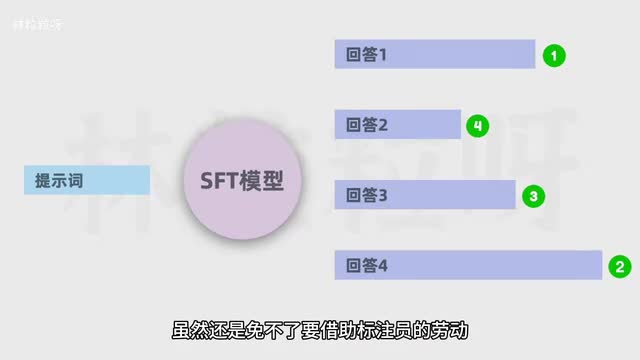那得到评分数据的方式是?让微调后的g p t模型,也就是第二步里得到的s f t模型,对每个问题生成多个回答,然后让人类标注员对回答质量进行排序。虽然还是免不了要借助标注员的劳动,但一旦有了足够的排序数据,就可以把数据用在训练奖励模型上,让奖励模型学习预测回答的评分。奖励模型训练出来后,就可以用在强化学习上了。