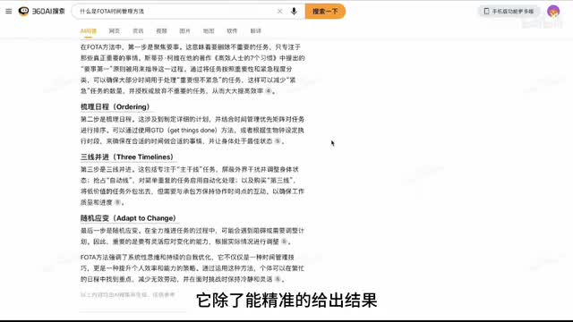 首先三六零a i浏览器集成了三六零a i搜索,这是我目前使用下来综合体验最好的一款a i搜索。我用我效率红利这本书上的知识点去考它它除了能精准的给出结果,并且还能梳理出清晰的脑图。和真人笔记一样,它甚至能为你的个性化提问,比如旅行计划定制结果,你可以直接拿来使用。