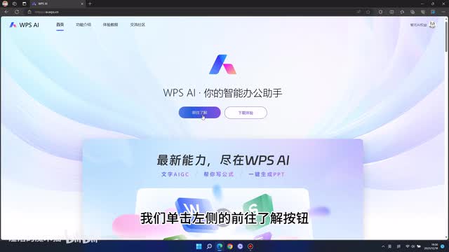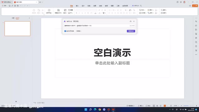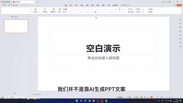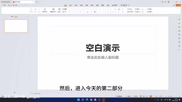 可以在顶部菜单中看到w p s a i的选项卡。然后。进入今天的第二部分。无文案的p p t生成。