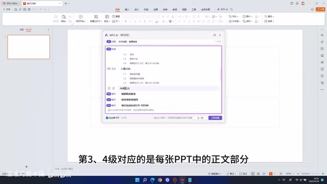 目前w p s a i一共有四级标题,第一集相当于章节标题过渡页,会新建一页。第二集为每张p p t顶部左上方的小标题,一般也会新建一页。第三四级对应的是每张p p t中的正文部分,所以他们一般会跟随上一个第一或二级标题存在于同一页中。这里我们需要对每一个条目的级别进行调整,按tab键可以降低一级,即从第一级往后降级。