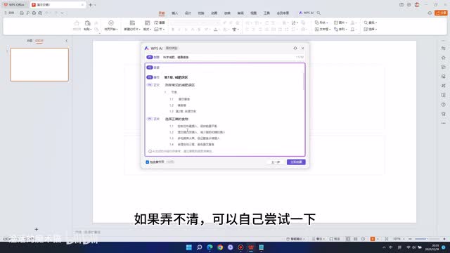 文案生成完毕后,我们可以进行人工修改。如果对文案不满意,可以单击上一步重新写提示词并再次生成。如果没有问题了,那就单击右下角的立即创建按钮,可以看到w p s a i很快生成了文案对应的p p t。如果对于p p t的外观模板不满意,可以在右侧选择更换模板。