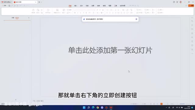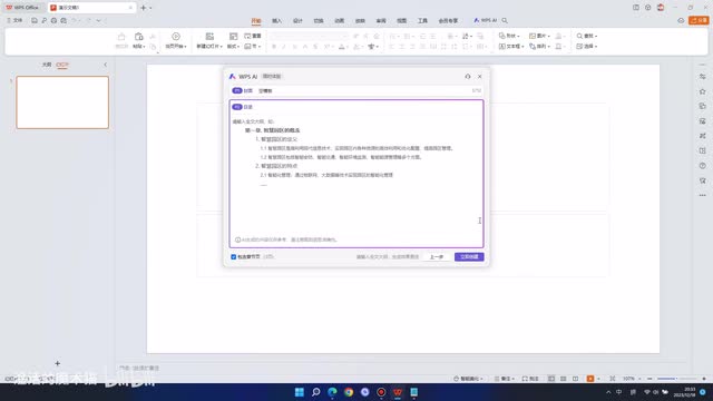 因为这里我只演示操作方法,所以写个简单的提示词。如果你有更加细致的要求,也可把提示词写的更加详细一些。写完以后,点击右下角的智能生成按钮。首先等待w p s a i生成p p t的文案部分。