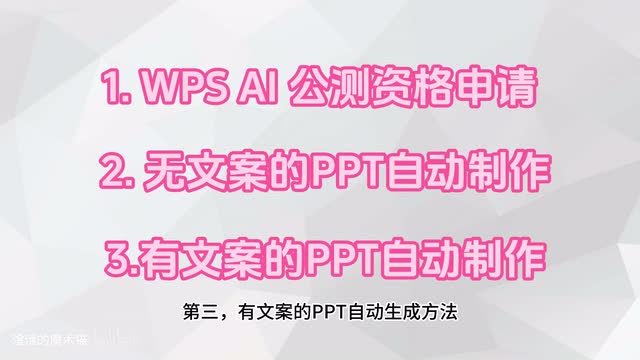 第二,无文案的p p t自动生成方法。第三,有文案的p p t自动生成方法。首先。由于w p s的a a i在上个月已经开始公测了。