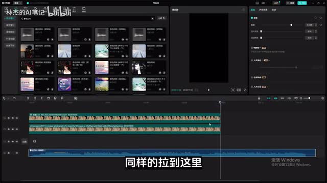 我们把视频呢这个图层往上拖动,盖住下面的图片,然后再往下拉一下,让他们基本是一比一的一个比例即可。好的,这个时候呢这个视频我们就已经调整完了。接着再来添加一下音频里面的背景音乐。在这里去搜索一首歌名叫做暮色回响。点击回车,然后呢选择一个十五秒钟的这种音乐放进来,接着将视频长度进行拖动一下,拉到最长。