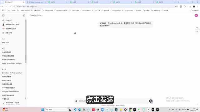 当然如果大家完全不满意,可以去更换指令。现在呢我们就来到了chat g p t的操作页面,在chat g p t的操作页面这里输入我们想要的一个指令。例如我让他帮我编写一段b卷的指令,要求帮我生成一张中国二十世纪九十年代美女的老照片,点击发送。好的,接着我们把这个指令复制一下,再回到mid这里的操作页面,输入生成图像的指令,将我们的指令复制粘贴进来。然后我们删除一些后缀指令,调整一下画面的比例,剩下的点击发送即可。