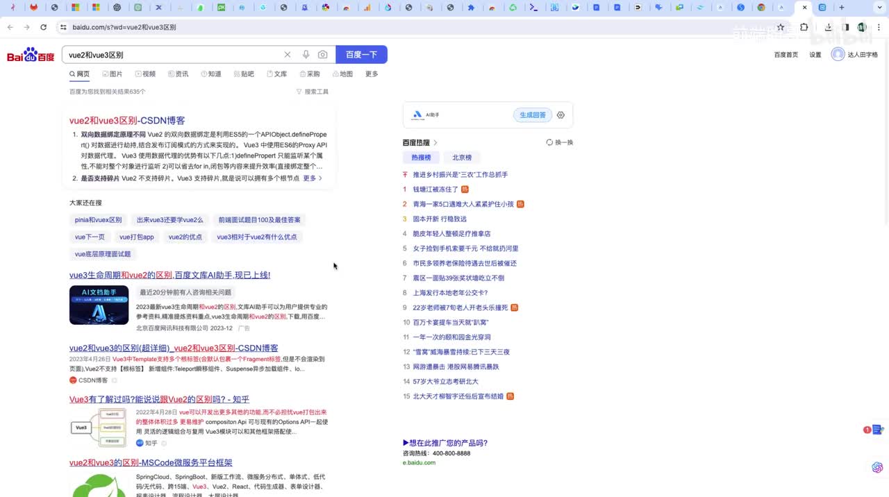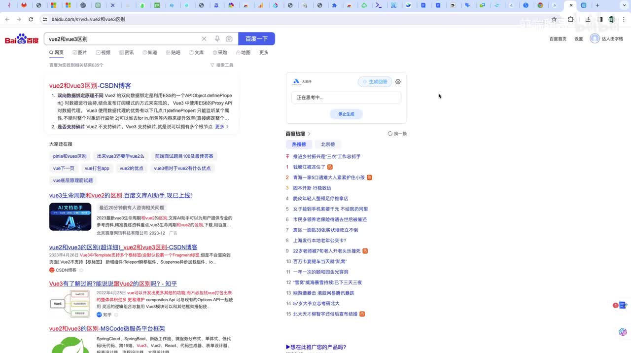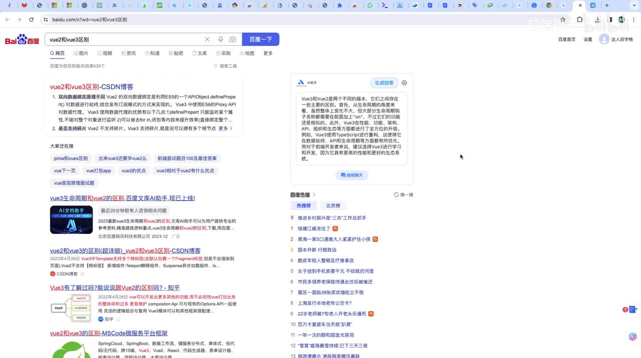 那么现在我给大家演示一下这一个神奇的功能。比如说我们现在在这个搜索框里面搜啊,查一个资料说v o二与v o三有什么区别。大家看我现在在百度搜索。