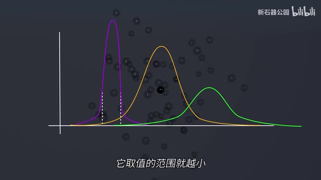 这意味着我们可以根据这个规律推算上一个时间点粒子可能的位置。但是请注意平均这两个字儿,这意味着这只是在大量粒子运动下计算出来的平均值。每个粒子的位置到底在哪里还是不知道。这就需要另外一个数学概念了,这个概念叫高斯分布。啥是高斯分布?如果你把全世界人的身高做一个统计,以横轴代表每一个身高区间,纵轴代表身高处于这一身高区间的人数就构成了一个直方图,然后你就会发现它形成这样的一个形状,大部分人集中在中间这个区域,越靠近两边人数就越少,但是下降速度也会变得平缓,这就是高斯分布。高斯分布也叫正态分布,为什么叫正态分布呢?因为它太常见了,很多大数据量的分布都是高斯分布。比如身高,比如体重,比如收入,比如高斯分布。
