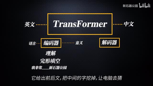 我们来看看transformer其后的发展。因为transformer是一个语言翻译模型,所以整个模型是由编码器和解码器两部分组成的。而这两部分的训练方法略有不同。编码器考验的是对语言的理解,所以它使用的训练方法是完形填空。它给出前后文,把中间的字挖掉,让电脑去猜。而解码器是要根据意思翻译成另外一种语言,所以它考验的是语言的生成,训练方法是词语接龙。后来谷歌和open a i分别拿走了编码器和解码器,搞出了自己的语言模型。谷歌的重在语言理解叫做bert。