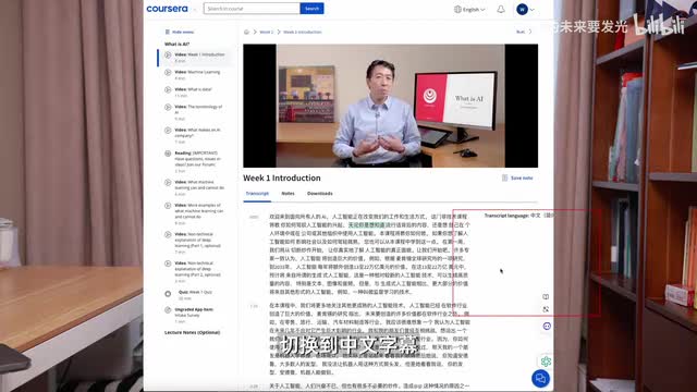比如说a i到底会不会影响我们的工作啊,以及数据泄露啊,然后算法偏见啊,道德隐私等等。这门课的听课地址呢就是在coursera这个网站上文达老师虽然是用英语来讲课,但是呢你都可以点击一下,切换到中文字幕。这门课呢也是cosa上面a i相关评分最高的课程,这个课呢有三十多个短视频组成,最长的视频十三分钟,最短的只有两分钟。内容呢安排成了四周,然后每周只需要学两个小时,学起来不会有很强的心理负担。