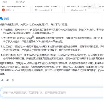 为什么。这块儿被抛抛被抛弃了吗?嗯,然后他有一些回答说功能重叠。因为现在新版本这个javascript很多都已经很多都已经满足了,就不需要再依赖jerry了。啊,还有大小性能的限制。