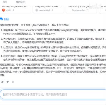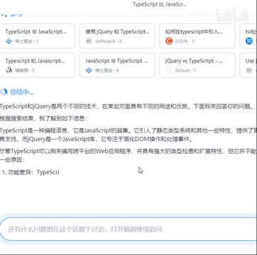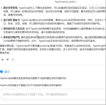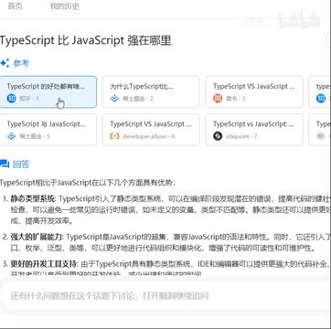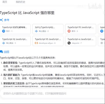 然后呃可能会有一些问题吧,人家这个time script静态类型,然后强大的扩展能力,更好的开发工具支持,更好的维护性。呃,他是一方面是能把这个答案给你答出来,另一方面是就像普通的搜索引擎一样,把可能前几个啊他认为好的结果给你。就是那个链接给给出你,你点开还是可以看的。有的有的网站啊,你点开还是可以看的。