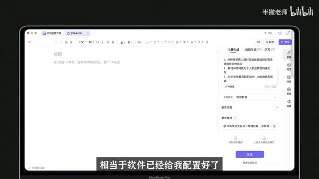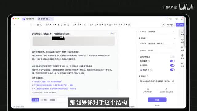 第三点是讨论一下未来的教育和职场当中a i的角色还有影响将来其实我们写作过程当中,最后那个升华的部分,我点击这边的写成文章,那其实就进入到创作的页面。右侧这边相当于软件已经给我配置好了,基本的提示词就是刚才的部分,包括了主体还有结构。但是其实a i还是不知道我的语言风格,我的字数要求,文章的类型等等的信息。所以我可以点击这边的更多设置。