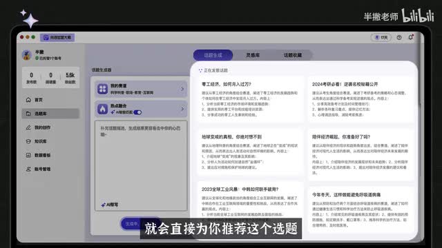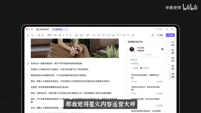 最近我收到星火内容运营大师的邀请,我第一次尝试使用ai工具,完成了从选题到发布全链条的操作。啊,不得不说几个月前我自己还在纠结说为什么没有这种系统的工作流a i工具啊,今天它就出现了。大家好,我是用a i陪你们在职场和人生升级两位的半屏老师。这期视频我会用实际的创作案例还有场景跟你系统去评测这个工具,以及教你怎么样更高效的利用ai来加速你的内容创作。