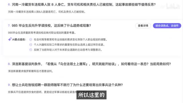 那当然好的选题呢,如果你包在这个热点话题下面去做,它的流量会更好。点击这边的灵感库,你还可以看到当下不同平台的热点。我找了一下,因为我的账号其实跟职场比较相关,所以这里的九八五毕业生反向升学读技校。当时的这个热点其实可以结合来做,但是具体做什么其实我还没有太大的概念,所以我们可以点击这边的结合热点去创作。