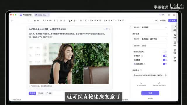 对接到头条公众号、百家号的平台,连标题在发布的时候都可以提供a i的建议。而且在封面的过程当中,你可以直接通过a i来进行改图。那当然在使用的过程当中,我觉得如果你要达到九十分的效果,当然你还可以上传你历史的文章作为参考资料来学习你文章的写作风格。避免你写作的语言总是有感觉a i味过重的这种感觉。