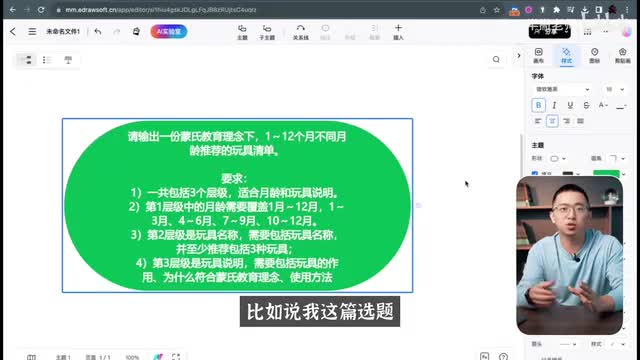 那导图的工具我用的是意图,是意图目前支持a i直接生成一个一键的思维导图,其实它的排版空间相对比较大,那怎么做呢?其实还是在意图的导图当中,我直接输入对应的指令和要求。比如说我这一篇选题要做的是蒙氏教育里面下的医院里的这个玩具,就不同的阶段应该买什么样的玩具。那我还提供一系列的要求,比如说它的成绩要求,它的自动要。求等等。那最后呢输入完了之后,a i还是一键帮我输出了这个导图。